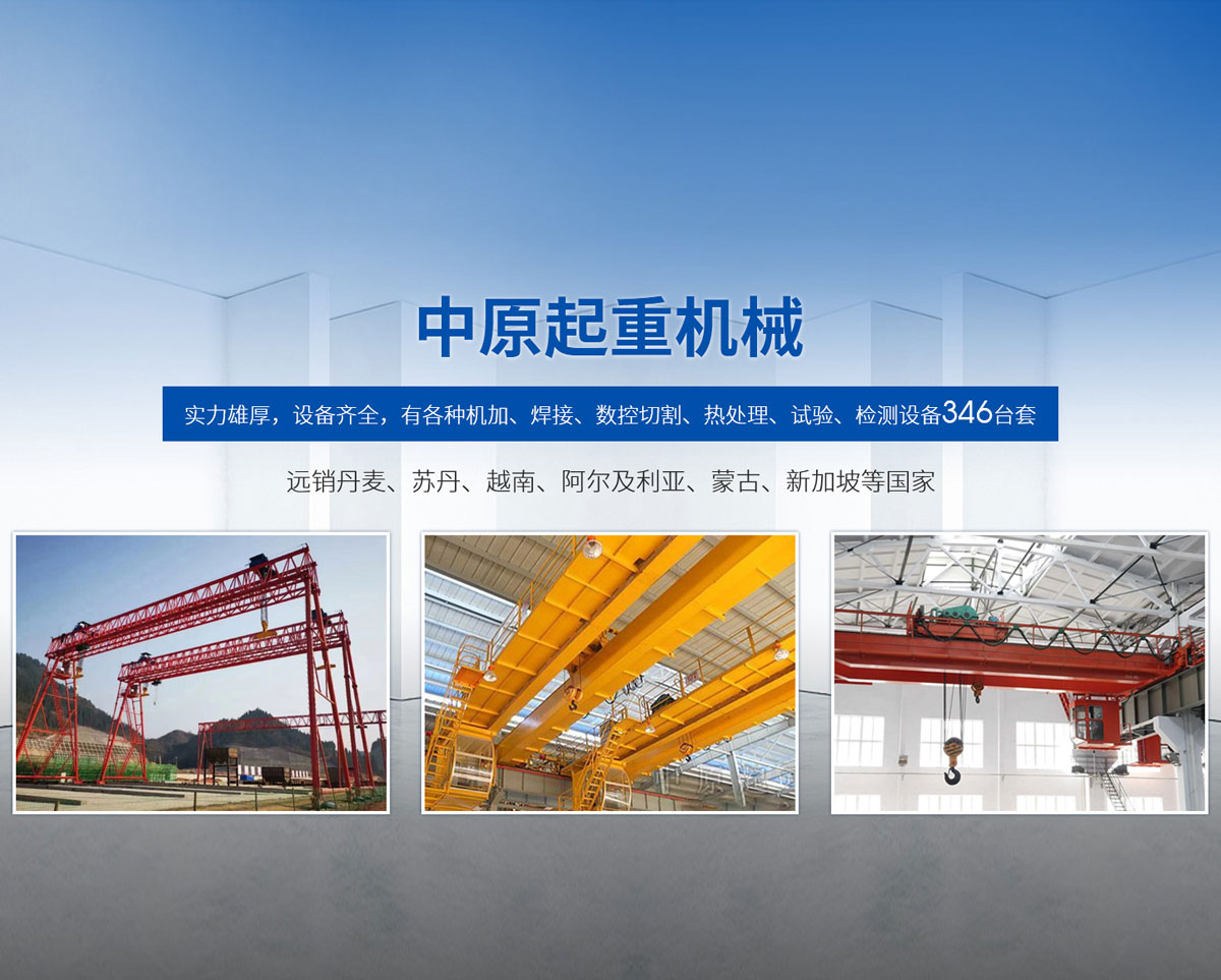 新鄉市中原起重機械有限公司成立于2000年,地處中原,輻射全國28個省市自治區,設外埠經銷處、辦事處268個。產品行銷工礦、建材、化工、冶金、電力、交通、鐵路、油田、港口等各個行業。遠銷丹麥、蘇丹、越南、阿爾及利亞、蒙古、新加坡等國家?! 」緦嵙π酆瘢O備齊全,有各種機加、焊接、數控切割、熱處理、試驗、檢測設備7臺;有機加工、熱處理、單、雙梁橋門機生產、檢測、安裝等9個車間,研究中心、運輸公司、安裝維修服務公司等機構,?  主要產品有:LD型1~20噸電動單梁起重機系列產品;5~600噸通用橋式、門式、冶金、上旋轉下旋轉電磁吊、絕緣、抓斗、防爆起重機系列產品;LH3~100噸葫蘆雙梁系列產品;MH5~32噸葫蘆門式系列產品;0.5~40噸CD1、MD1鋼絲繩電葫蘆系列產品;HS1型0.5~20噸手動葫蘆系列產品;0.5~10噸環鏈電動葫蘆系列;0.5~40噸彎道電動葫蘆系列產品;裝卸橋、造船門機、架橋機、鑄造吊和水電大噸位起重機系列產品。  公司建立了強有力的質量保證體系和生產過程的質量控制系統,嚴格執行國家設計、生產標準,有嚴格的生產工藝過程和標準,嚴格的檢驗、檢測標準和手段。